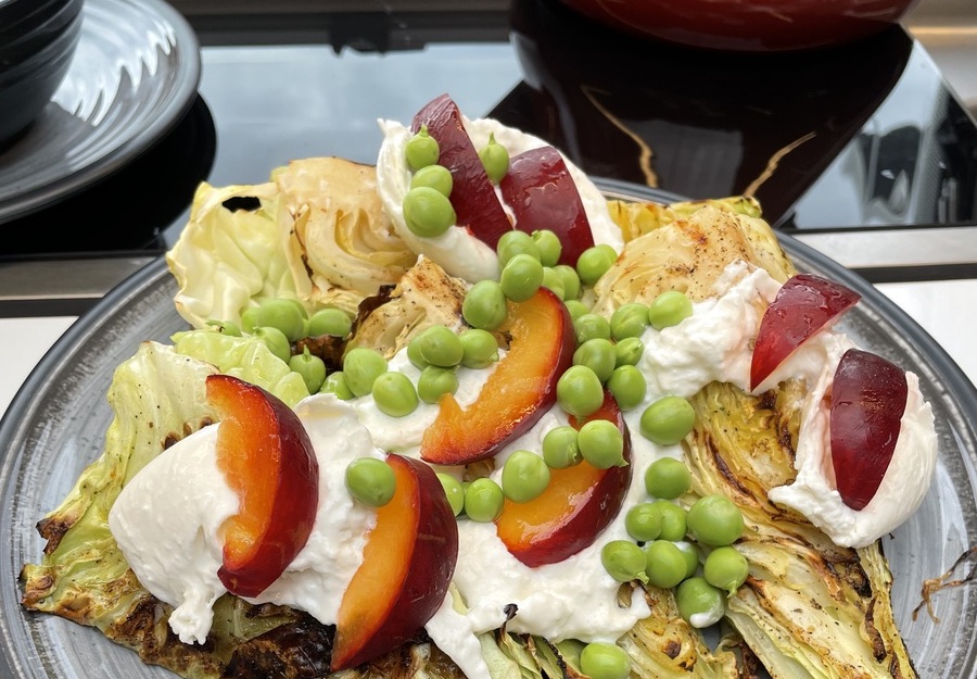 Del spidskålen i kvarte, skær stokken væk. pensel med olie drys med salt & peber. Sæt kålen i oven 200gr ca. 20-25 min eller på grill vend den på alle sider til den er mør ca.10-15 min. Fordel burrataen over kålen, skær 1-2 modne blommer i skiver og pynt med dem, og hæld 200 gr […]