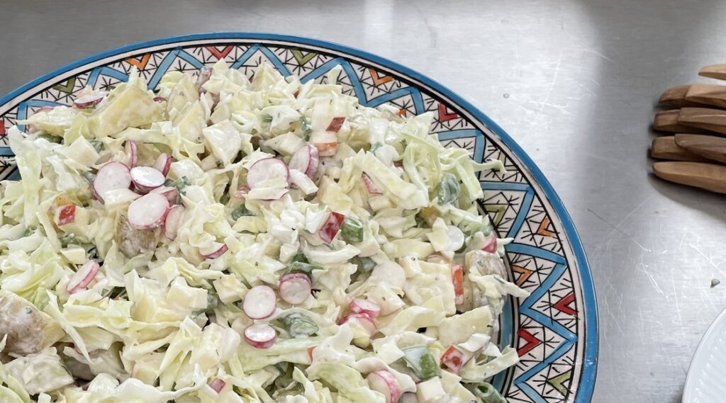 kog 700 gram kartofler Snit et bundt radisser Snit et halvt spidskål Snit et æble Snit en pose sukker ærter, kan også bruge asparges, frosne ærter, edamamebønner Dressing: Et bæger rygeost ca 170-200 gram 50 gram mayonnaise Røres sammen, tilsæt vand, til det har tykkelse som mælk, smag til med slat & peber og 1 […]